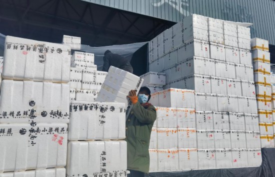 “车来喽!”“往里倒,再倒,好,装车!”尽管天气寒冷,市场里却是一片火热的繁忙景象。从各地运来的蔬菜陆续进场,工作人员手脚麻利地将成箱的蔬菜从大车上卸下再装上小车,随后,这些蔬菜将运往宁夏各地小型批发市场和商超。“为了蔬菜在运输过程中不被冻坏,我们给蔬菜盖了3层棉被,确实下了一番功夫。”商户马伏珍说。